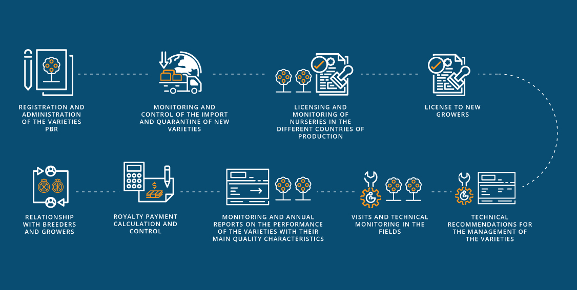 Our main objective is to discover and obtain the maximum potential of the varieties, and through a close relationship with the growers, guide and advise them at each stage of production so that they achieve the maximum potential in view of the attributes and windows required by the markets.